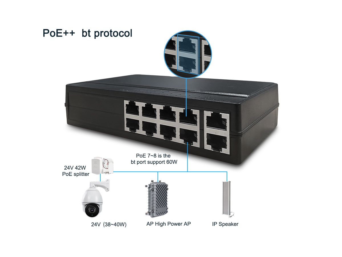 - Portok (7-8): IEEE 802.3af/at/bt, akár 60W teljesítmény támogatása