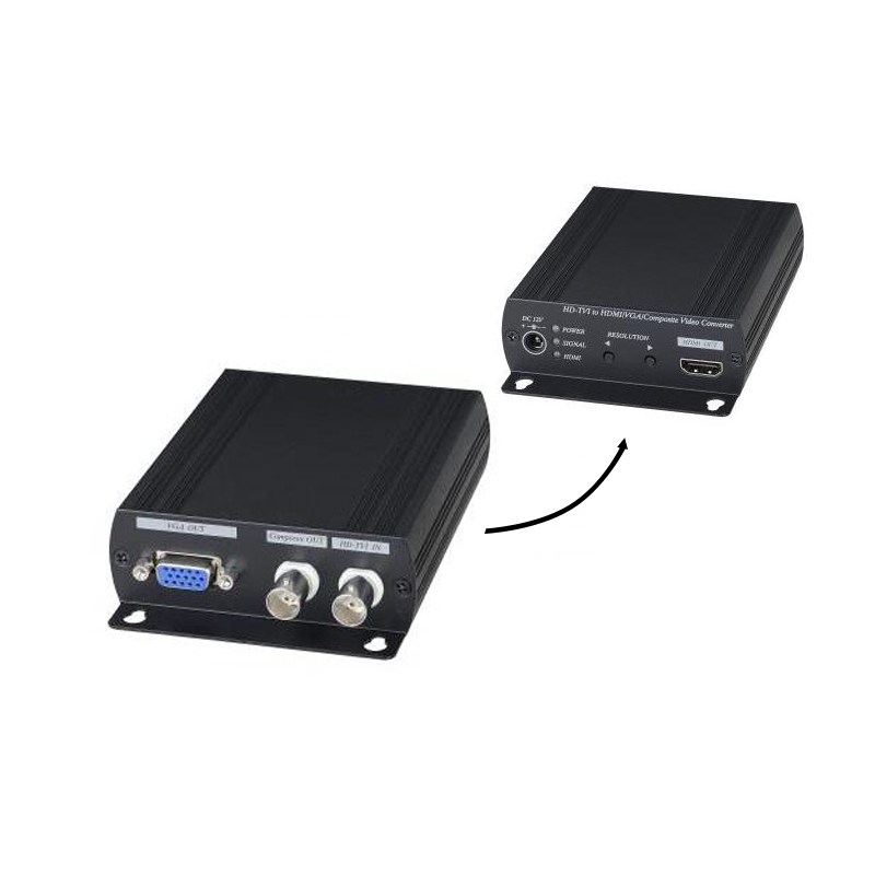 SC&T Videojel VGA/HDMI átalakító, BNC (AHD/HD-TVI/HD-CVI/CVBS) video bemenet, áthurkolt AHD/HD-TVI/HD-CVI vagy átalakított CVBS kimenet, VGA/HDMI kimenet, 2 csatornás AHD switcher funkció, támogatott HDMI/VGA felbontások: 480P/576P/720P/1080i/1080P, támogatott frekvencia: 50/60/Hz, támogatott AHD/HD-TVI/HD-CVI felbontások: 720P(25/30Hz)/720P(50/60Hz)/1080P(25/30Hz), 12Vdc (500mA), 230Vac adapterrel
