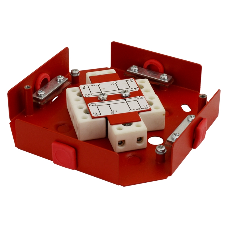 PULSAR Szétosztó kötődoboz 4x2,5mm2. Nemzeti tanúsítvány a teljesítmény állandóságáról No 063-UWB-0174. Nemzeti műszaki értékelés CNBOP-PIB CNBOP-PIB-KOT-2019/0109-3704. Tűzállósági osztály: E30, E60, E90. Feszültség: 450V AC max. Dobozba bevezethető kábel keresztmetszet: max 10mm. Beköthető vezeték keresztmetszet: max. 2,5mm2. Védelmi osztály: IP20. Doboz anyaga: DC01 1mm acéllemez, szín: RAL3001 (piros). Méret: Szé=120 Ma=120 Mé=37 mm