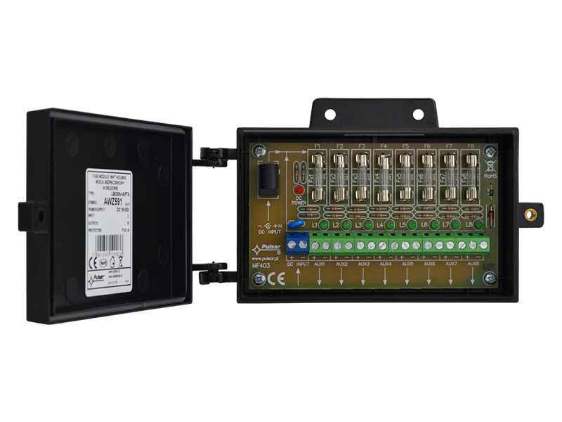 PULSAR FTA biztosíték modul műanyagházban. Feszültség: 10÷30VDC. Kimeneti feszültség: 8x1A - TOPIC. Vezeték keresztmetszet: max. 2mm2. Bemenetek/kimenetek száma: 2/8. Védelem: SCP, OLP*, túlfeszültség védelem. Kiegészítő funkciók:- tápfeszültség bemenet - DC 5.5/2.1 aljzat.- LED kijelzés. Rögzítés: Falra szerelhető - 2 rögzítő csavarral, oszlopra - bilinccsel. Méret: Szé=150, Ma=94, Mé=42 (+/-2mm). Megjegyzés:- kötődoboz - csavarral zárható - műanyag ház