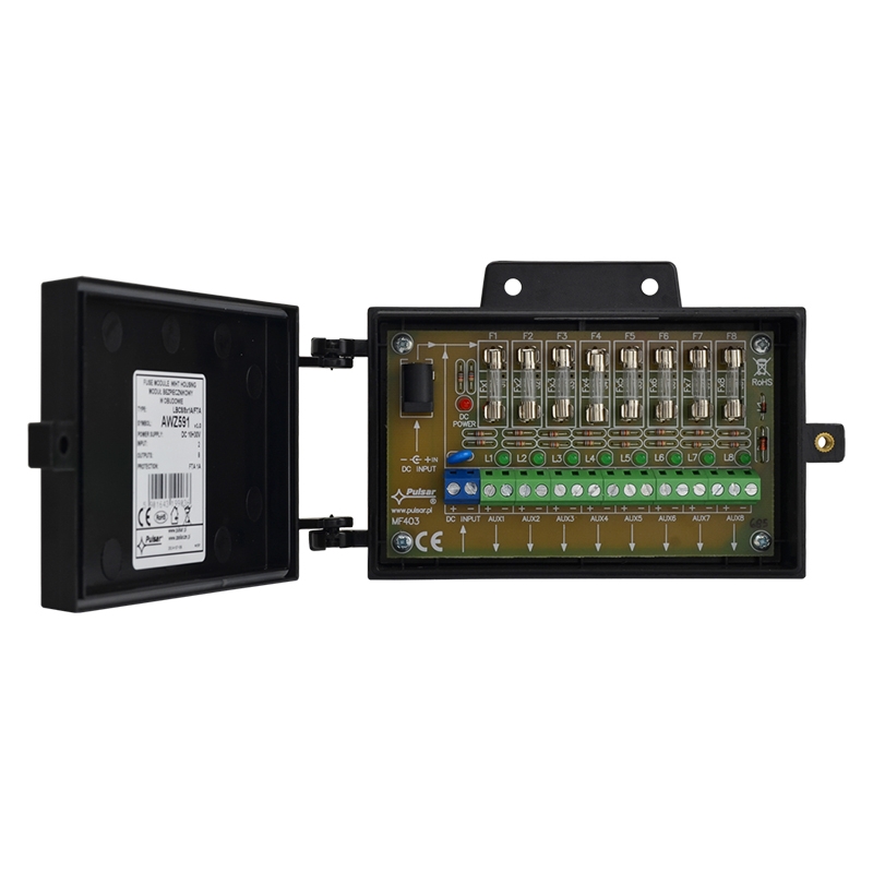 PULSAR FTA biztosíték modul műanyagházban. Feszültség: 10÷30VDC. Kimeneti feszültség: 8x1A - TOPIC. Vezeték keresztmetszet: max. 2mm2. Bemenetek/kimenetek száma: 2/8. Védelem: SCP, OLP*, túlfeszültség védelem. Kiegészítő funkciók:- tápfeszültség bemenet - DC 5.5/2.1 aljzat.- LED kijelzés. Rögzítés: Falra szerelhető - 2 rögzítő csavarral, oszlopra - bilinccsel. Méret: Szé=150, Ma=94, Mé=42 (+/-2mm). Megjegyzés:- kötődoboz - csavarral zárható - műanyag ház