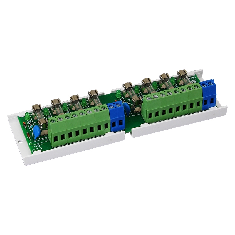 PULSAR FTA biztosíték modul. Feszültség: 10÷30VDC / 10÷24VAC. Kimeneti feszültség: 8x1,5A. Vezeték keresztmetszet: max. 2,5mm2. Bemenetek/kimenetek száma: 2/8. Védelem: SCP, OLP*, túlfeszültség védelem. Kiegészítő funkciók: LED kijelzés. Rögzítési opciók: rögzítő keret csavarral vagy kétoldalas ragasztóval. Méret: L=144, W=43, H=26 (+/-2mm). Megjegyzés: szétosztó/kötő modul