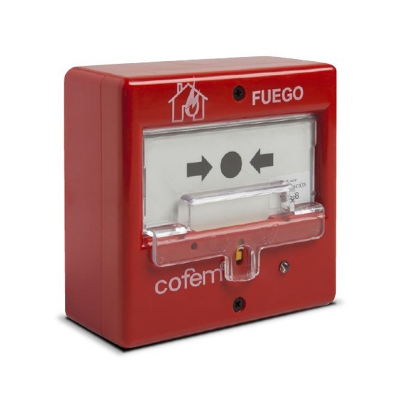 COFEM Kézi jelzésadó, fedéllel, algoritmikus, címezhető és visszaállítható, izolátorral. CE jelöléssel és EN 54-11 tanúsítvánnyal.