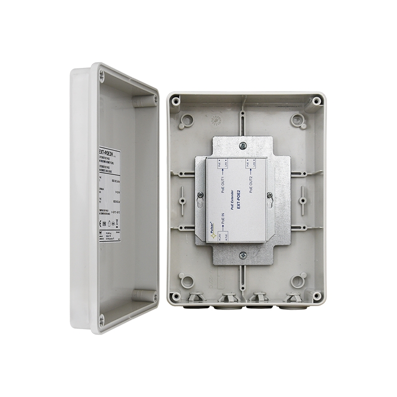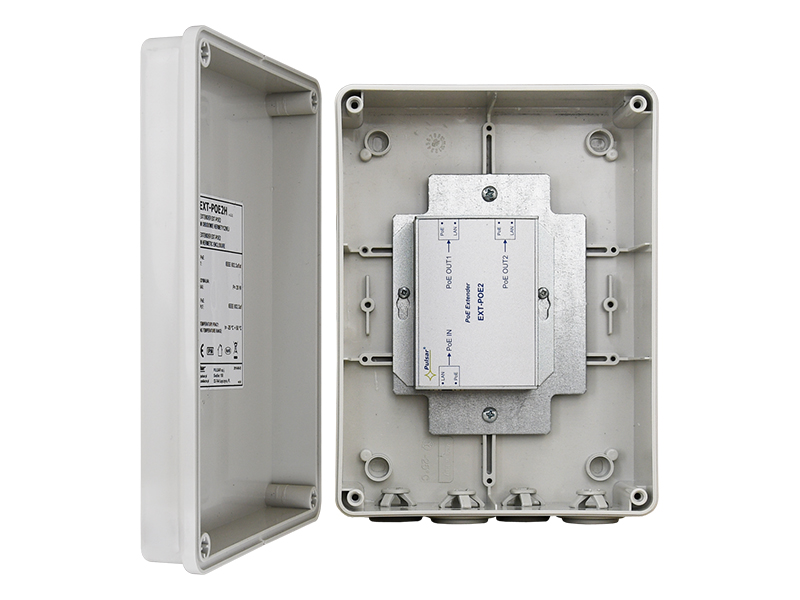 PULSAR hermetikusan zárt doboz. Terveztt felhasználás: Increases Ethernet and PoE power range by 100 meters. Allows connecting two IP-PoE cameras using a single cable. PoE input: PoE IN – compliant with IEEE802.3af/at. PoE kimenet: PoE OUT1 / PoE OUT2 – compliant with IEEE802.3af. Kimeneti áram PoE OUT: 0,3A/port (0,4A max.). Védelem: OLP, SCP*. Működési hőmérséklet: -25°C÷50°C. Méret: Szé=198 Ma=148 Mé=78 [+/- 2mm]. The number of cable glands/cable diameter: 4pcs. / 6÷13mm. Megjegyzés:10Mbit/s és 100Mbit/s hálózatokhoz használható. hermetikus doboz IP56, surface mounted enclosure, locking – bolted. pole mounting option (requires OZB2 adapter – optional accessory)