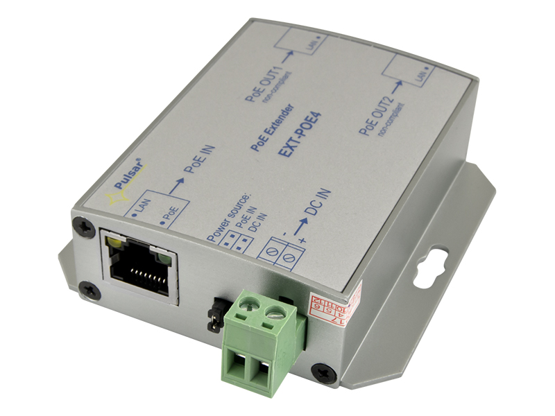 PULSAR Extender Tervezett felhasználás: increases Ethernet and PoE power range by 100 meters. Kimeneti feszültség: 44÷57VDC. PoE input: PoE IN - compatible with the IEEE 802.3af/at standard. PoE kimenet: PoE OUT1 / PoE OUT2 - nem felel meg az IEEE802.3af. Kimeneti áram PoE OUT: 0,3A/port (0,4A max.). Védelem: OLP, SCP*. Méret: L=81 W=77 H=26 [+/- 2mm]. Szerelési: rögzítő csavar. Megjegyzés:10Mbit/s és 100Mbit/s hálózatokhoz használható