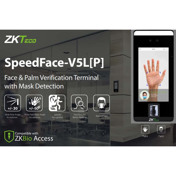 A ZKTeco SpeedFace-V5L egy fejlett, többfaktoros azonosítást biztosító biometrikus beléptető terminál, amelyet kifejezetten professzionális felhasználásra terveztek. A készülék a legújabb deeplearning-alapú arcfelismerő algoritmusokat alkalmazza, és a legmodernebb számítógépes látás technológiát integrálja a gyors, pontos és megbízható azonosítás érdekében.