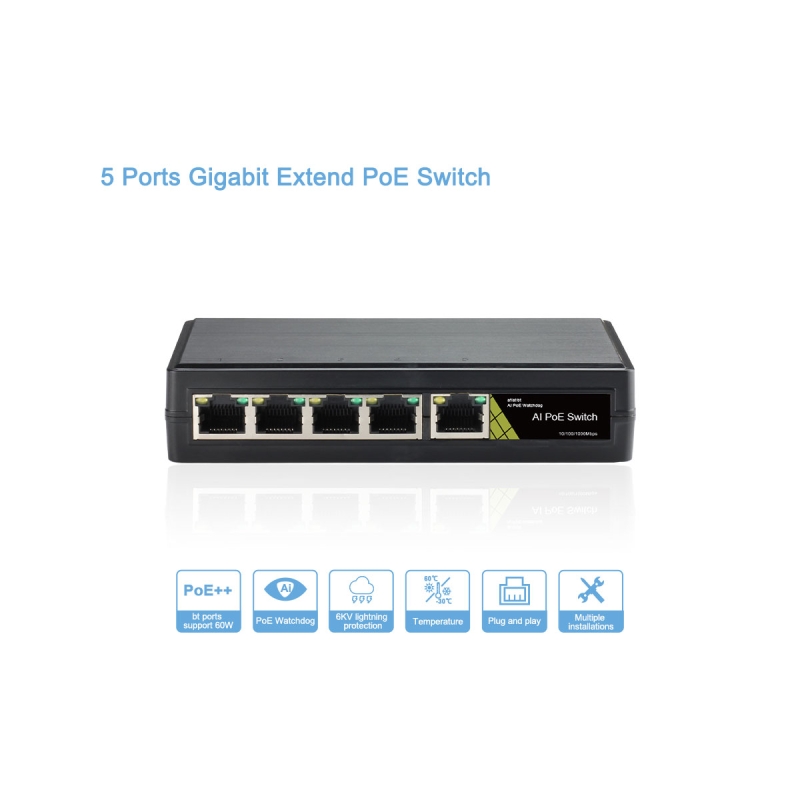 A GNT-69P51G6 egy kompakt kialakítású, ipari kivitelű PoE switch, amelyet kis- és közepes méretű hálózati rendszerekhez terveztek. Összesen négy PoE porttal és egy uplink porttal rendelkezik, melyek közül az egyik támogatja a 802.3bt szabvány szerinti, akár 60 W teljesítményű tápellátást. A beépített AI Watchdog funkció automatikusan újraindítja a nem válaszoló eszközöket, így növeli a rendszer megbízhatóságát. A termék ideális IP kamerák, vezeték nélküli hozzáférési pontok és egyéb PoE-t igénylő eszközök tápellátására és adatkapcsolatára, különösen olyan környezetekben, ahol a megbízhatóság és a védelem elsődleges szempont.
