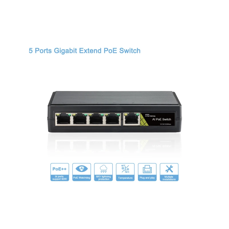 A GNT-69P51G6 Extend PoE Switch ideális választás olyan telepítésekhez, ahol a megbízhatóság, a hosszú távú működés és a nagy teljesítményű PoE tápellátás alapkövetelmény. Kompakt mérete és ipari kialakítása révén szűk helyeken is könnyen elhelyezhető, miközben a beépített védelemmel és intelligens funkciókkal hosszú távon is stabil működést biztosít. Kiváló megoldás IP alapú megfigyelőrendszerekhez, vezeték nélküli hálózatokhoz és egyéb PoE-t igénylő alkalmazásokhoz.