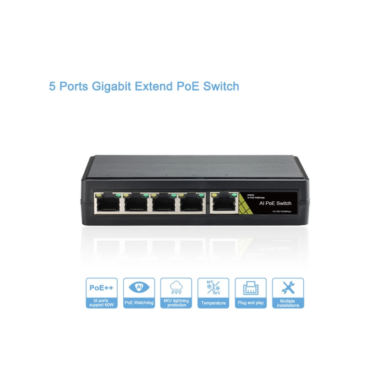 - PoE portok: 4 × RJ45 (10/100/1000 Mbps), 1 port támogatja a 60 W bt szabványt