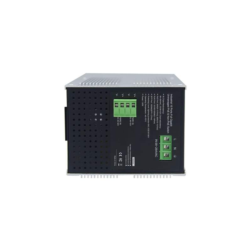 A switch kettős redundáns bemeneti tápellátással rendelkezik, amely 90-264V AC vagy DC48-52V között működik. Ez a kialakítás biztosítja a folyamatos működést és minimalizálja a leállások kockázatát.