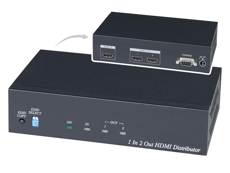 SC&T HDMI osztó, 1 HDMI bemenet, 2 HDMI kimenet, 3D, 4Kx2K támogatása, Digitális audio formátumok támogatása: DTS-HD/Dolby-true HD/LPCM 7.1, beépített EDID tanulási/integrációs funkció, RS232 csatlakozó (Firmware frissítéshez), DC5V/2A tápegység