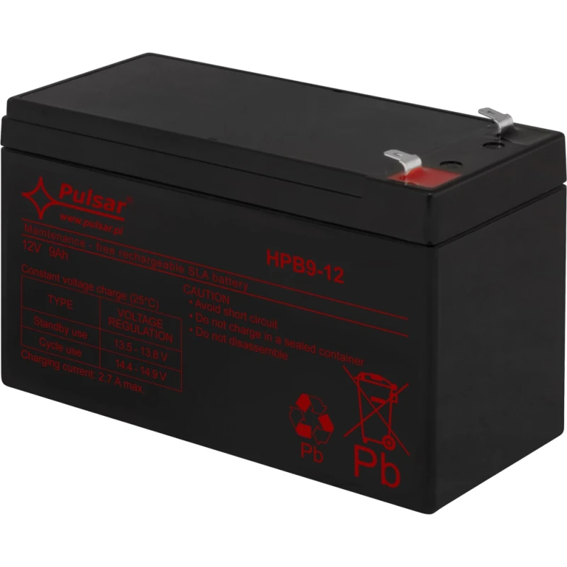 PULSAR AGM technológiával készült karbantartásmentes 12 V, 9 Ah akkumulátor várható élettartam 5-8 év, 20 °C-on ajánlott töltési áramerősség: 0,9 A maximális töltési áramerősség: 2,7 A 152 x 100 x 65 mm