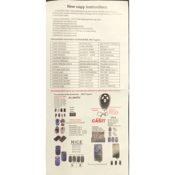 • Univerzális kompatibilitás fix és a leírásban megadottak szerint többféle ugrókód 433,92 MHz és 315 MHz frekvencián