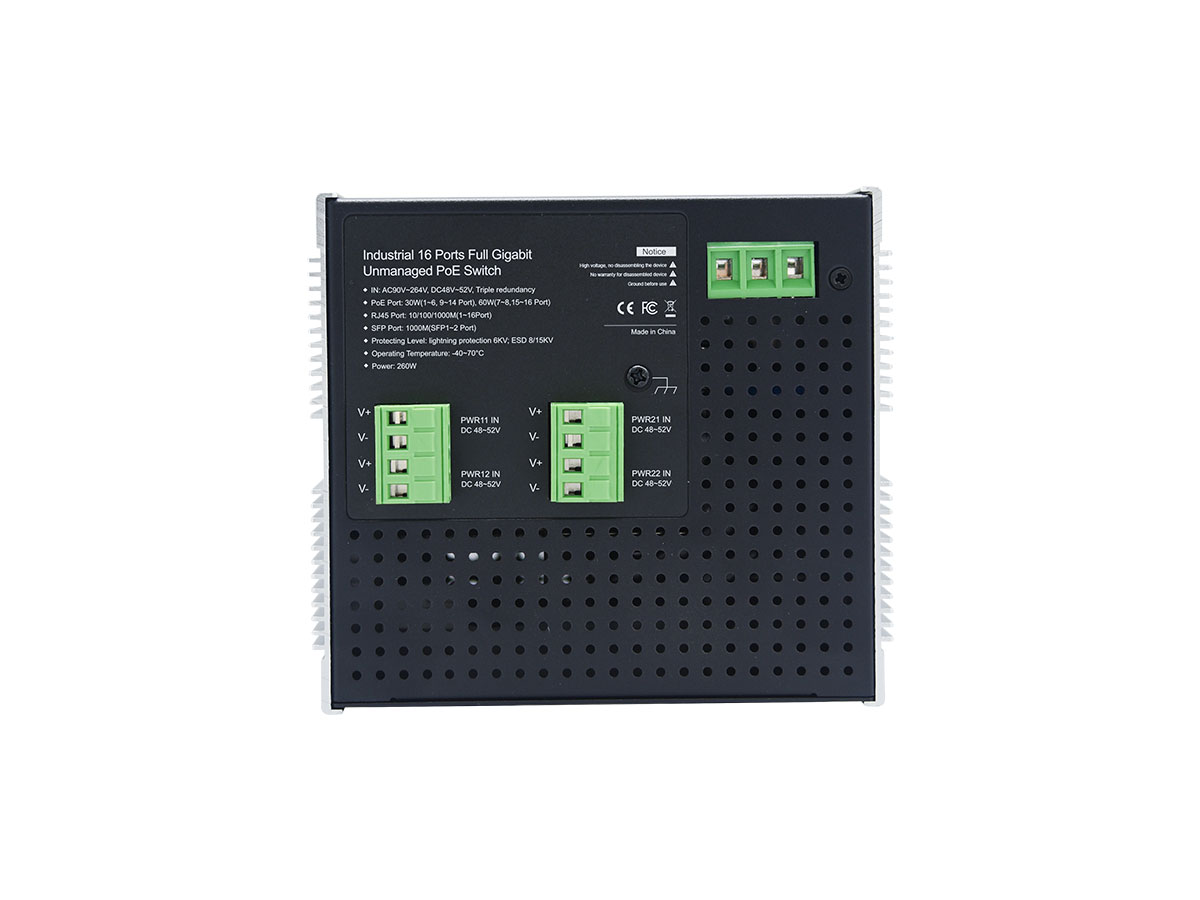 A switch összteljesítménye 260W, amely elegendő energiát biztosít a csatlakoztatott eszközök számára, beleértve a nagy teljesítményű PoE eszközöket is. A háromszoros redundáns tápellátás tovább növeli a rendszer megbízhatóságát.