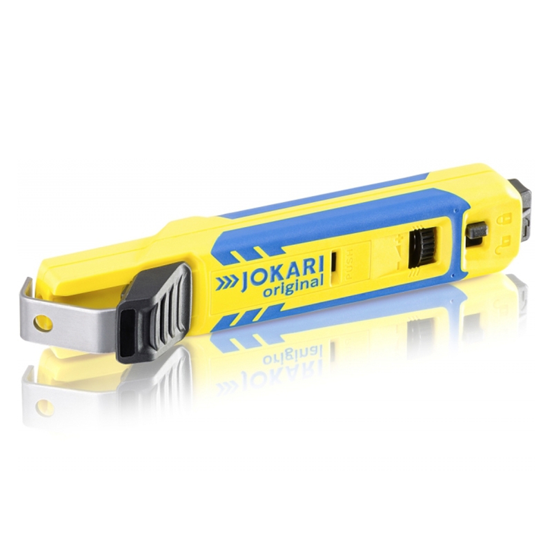JOKARI Inteligens kábelkés rendszer, Intelligens cserélhető befogó kampó rendszer, legtöbb 4 - 70 mm R közötti kábeltípushoz, vágás pontossága ellenőrizésére szolgáló kémlelő nyílás, 8-28 mm R alapszerszám, automatikusan záródó penge védelem, biztonsági kapcsoló, egyszerű horogcsere, ergonomikus kivitel