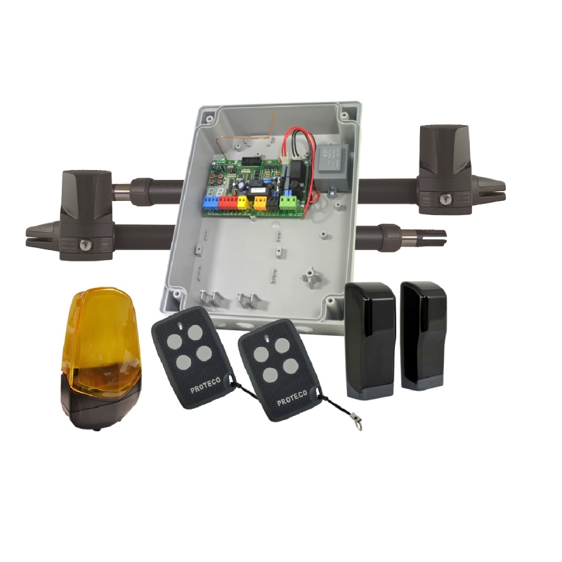 A PROTECO Szárnyaskapu Mozgató Szett egy megbízható, professzionális megoldás családi házak szárnyaskapuinak automatizálására. Az olasz gyártású szett kimagasló minőségű alkatrészeket tartalmaz, amelyek garantálják a hosszú élettartamot és a zavartalan működést. Ideális választás közepes súlyú, 200-300 kg-os kapuszárnyakhoz, akár 3,5 méteres szélességig.