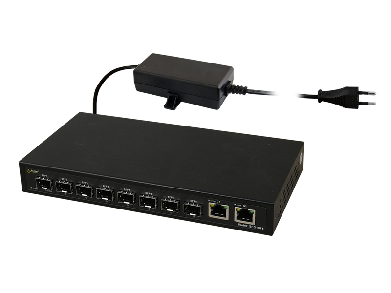 PULSAR SFG10F8 optikai kapcsoló (8xSFP, 2xRJ45) Optikai kapcsoló SFG10F8 (8xSFP, 2xRJ45). Alkalmazás: Az SFG10F8 egy 10 portos optikai switch, amely adatátvitelre szolgál Etherneten keresztül száloptikán és UTP kábeleken keresztül. Cat 5e. Switch has 8 SFP sockets (marked SFP1 ÷ SFP8), which after using SFP modules (GBICs) enable fiber optic transmission. Tápfeszültség: 230VAC, 12VDC/2A/24W tápegység (asztali típus) tartozé. Portok száma: 10 port (2xUPLINK RJ45 + 8xUPLINK – SFP csatlakozó). UPLINK ports: 2 port 10/100/1000 Mb/s – G1 és G2 – rögzítőhöz / switch / számítógép. Outlets: SFP UPLINK: 8 port 10/100/1000 Mb/s – SFP1÷SFP8 – for connecting further network devices by fiber optic cable. Méret: Szé=221 Ma=29 Mé=115 [+/- 2mm]. Megjegyzés:- Támogatott protokoll és szabvány: IEEE802.3, 802.3u, 802.3x, CSMA/CD, TCP/IP- port aljaz: RJ45, SFP- függőleges szereléshez szükséges rögzítő L konzol tartozék
