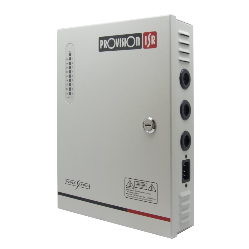 PROVISION-ISR Tápegység CCTV-hez, 16 csatornás, zárható fémdobozban, 110/230 Vac bemenet, 12-14 Vdc (szabályozható) max. 12A kimenet