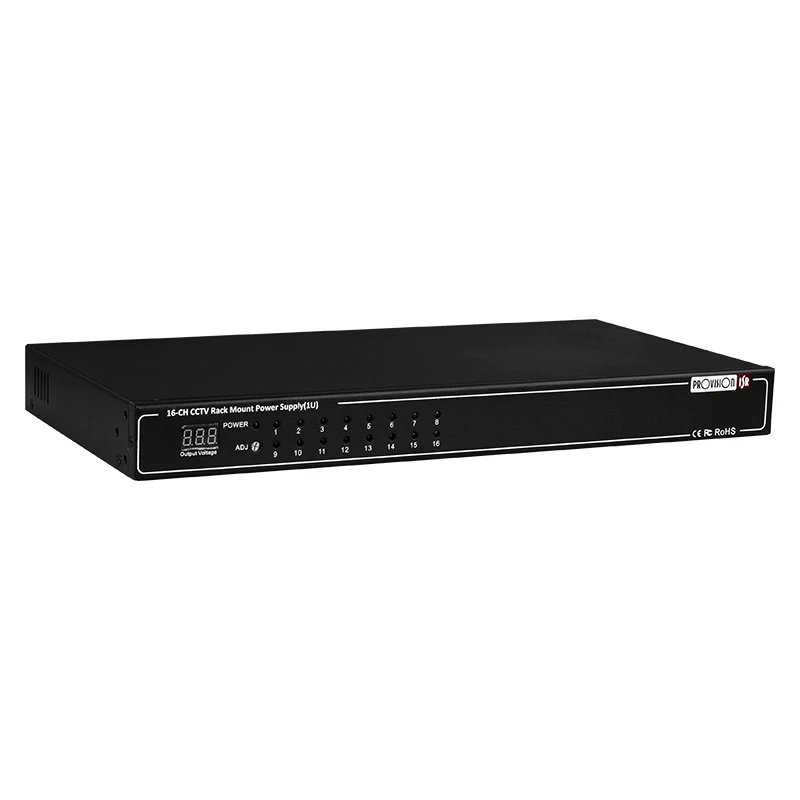 PROVISION-ISR Tápegység CCTV-hez, 16 csatornás 1U (rackbe szerelhető) házban, 100-240 Vac bemenet, 11-15 Vdc (szabályozható), max. 20A kimene