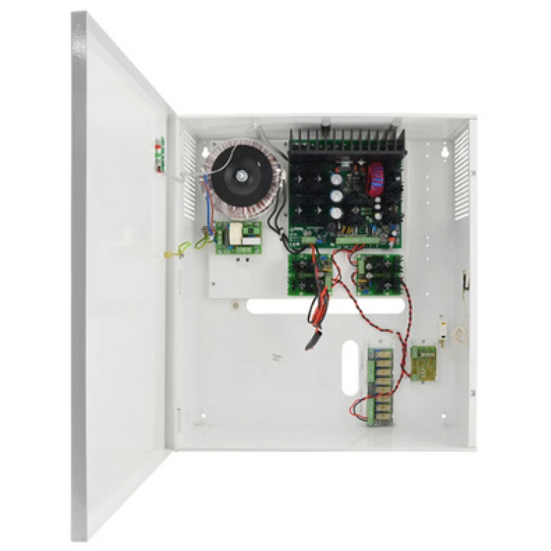 PULSAR PSUPS 8+1 csatornás kapcsolóüzemű CCTV tápegység akkumulátortöltővel, kimenet 12 Vdc/8x 0.5 A + 1x 5 A, 4 fokozatban állítható akkumulátor töltőáram, rövidzár-, túlterhelés-, túlmelegedés-, túlfeszültség- és akkumulátor mélykisütéselleni védelem, AC hiány, tápegység és akkumulátor működési állapot jelző OC kimenet, 50mA, jelző LED-ek, 12 V/ 40 Ah akkumulátorhely, kettős szabotázskapcsoló, 0.5 A@50 Vdc, kinyitás és falról történő eltávolítás elleni védelem, működési hőmérséklet -10°C~+40°C, méret 370x400x170 mm