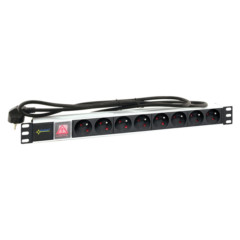 PULSAR 230VAC konnektor, 8 csatlakozó aljzat. Javasolt felhasználás: RACK szekrényekbe építhető kivitel, 230VAC betáplálásű eszközök csatlakoztatásához (8 eszköz). Szerelési méret: Szé=19", Ma=1U. Anyag: elsőfedél, ABS, fekete, külsőkeret - aluminium. Aljaztok száma: 8. Terhelhetőség: 3500W. Megjegyzés:- aljzat típusa: E. - dugó típusa: E/F („Unischuko”). - villágító halózatikapcsoló. - 4 pontos rögzítés a RACK sín első sínén. - 4 M6 csavar + kosáranya tartozék