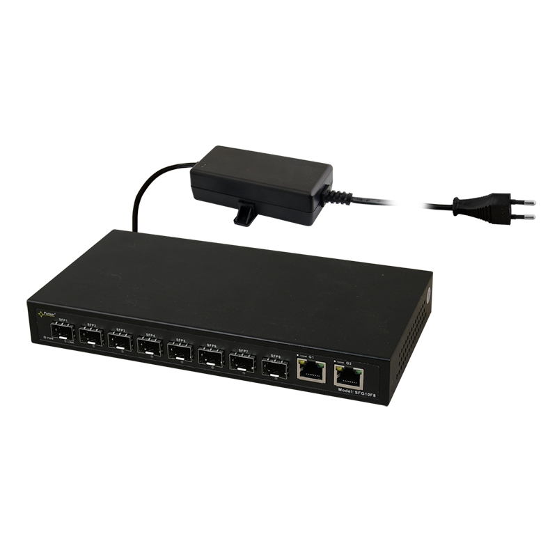 PULSAR SFG10F8 optikai kapcsoló (8xSFP, 2xRJ45) Optikai kapcsoló SFG10F8 (8xSFP, 2xRJ45). Alkalmazás: Az SFG10F8 egy 10 portos optikai switch, amely adatátvitelre szolgál Etherneten keresztül száloptikán és UTP kábeleken keresztül. Cat 5e. Switch has 8 SFP sockets (marked SFP1 ÷ SFP8), which after using SFP modules (GBICs) enable fiber optic transmission. Tápfeszültség: 230VAC, 12VDC/2A/24W tápegység (asztali típus) tartozé. Portok száma: 10 port (2xUPLINK RJ45 + 8xUPLINK – SFP csatlakozó). UPLINK ports: 2 port 10/100/1000 Mb/s – G1 és G2 – rögzítőhöz / switch / számítógép. Outlets: SFP UPLINK: 8 port 10/100/1000 Mb/s – SFP1÷SFP8 – for connecting further network devices by fiber optic cable. Méret: Szé=221 Ma=29 Mé=115 [+/- 2mm]. Megjegyzés:- Támogatott protokoll és szabvány: IEEE802.3, 802.3u, 802.3x, CSMA/CD, TCP/IP- port aljaz: RJ45, SFP- függőleges szereléshez szükséges rögzítő L konzol tartozék
