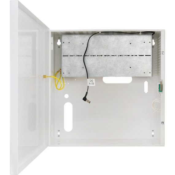 A tápegység háza tartós, 1 mm vastagságú DC01 típusú acéllemezből készült, amely RAL9003 (fehér) porszórt bevonattal van ellátva, így ellenáll a korróziónak és mechanikai behatásoknak. A burkolat kialakítása lehetővé teszi a falra vagy egyéb sík felületre történő egyszerű és biztonságos rögzítést.
