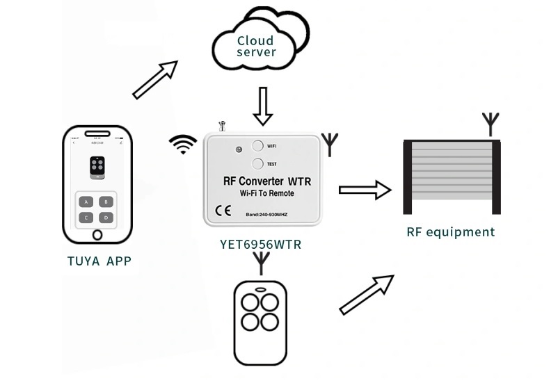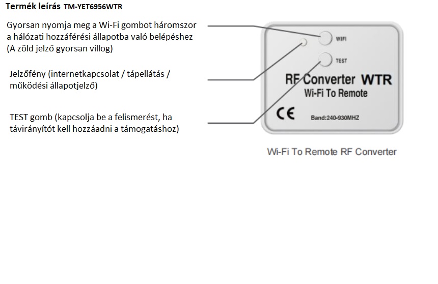 Megtanítható a több márkájú fix kódú és ugró kódú távirányító, és az eredeti távirányítót rátanítva a továbbiakban távirányítóként működik WiFi-n kereszül TUYA alkalmazással.