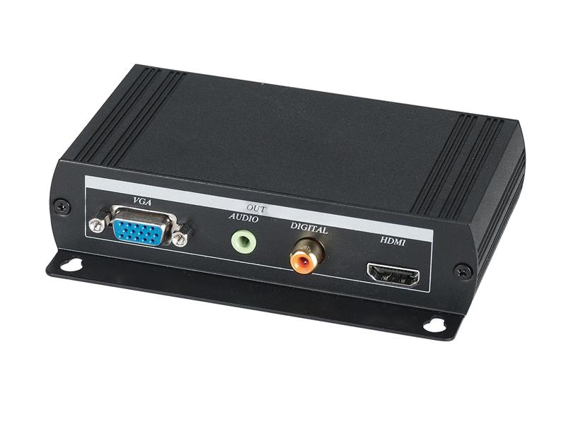 SC&T VGA-HDMI átalakító, VGA video és jack sztereó audio bemenet, áthurkolt VGA és jack sztereó audio kimenet, OSD menü, támogatott felbontások: 640x480/800x600/1024x768/1280x960/1280x1024/1360x768/1440x900/1600x100/1920x1080, támogatott frekvencia: 56/60/70/72/75/85Hz, 5Vdc, 230Vac adapterrel