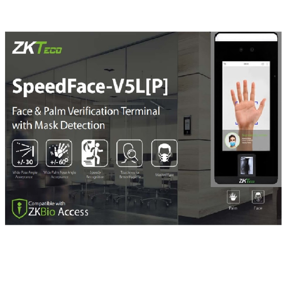 A ZKTeco SpeedFace-V5L egy fejlett, többfaktoros azonosítást biztosító biometrikus beléptető terminál, amelyet kifejezetten professzionális felhasználásra terveztek. A készülék a legújabb deeplearning-alapú arcfelismerő algoritmusokat alkalmazza, és a legmodernebb számítógépes látás technológiát integrálja a gyors, pontos és megbízható azonosítás érdekében.
